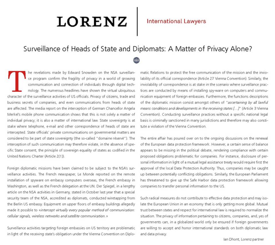Brussels - March 26, 2014: Jan Dhont wrote an article for the Diplomatic World Issue Nr 42 on Surveillance of Heads of State and Diplomats